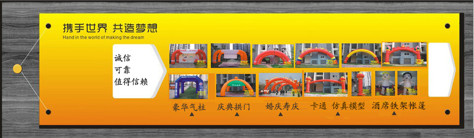 我厂长期生产各种款式气模拱门、宫灯气柱、卡通、仿真气模造型、充气活动帐篷、金色气模、婚庆寿庆气模、白事气模、酒席铁架帐篷等,规格齐全。各种款式可以根据要求订做尺寸大小。欢迎合作! 一、拱门气模:彩虹单气模拱门、方形单气模拱门、龙凤拱门气模、连体气模拱门、充气帐篷拱门气模、异形气模拱门、婚庆节庆拱门气模、白事气模拱门 二、立柱气模:豪华华表灯笼立柱气模、 三、卡通气模:行走卡通气模、座地卡通气模、充气产品造型气模、充气文字字体气模、空中舞星气模、 四、升空气球印刷、小气球印刷 五、帐篷、广告伞